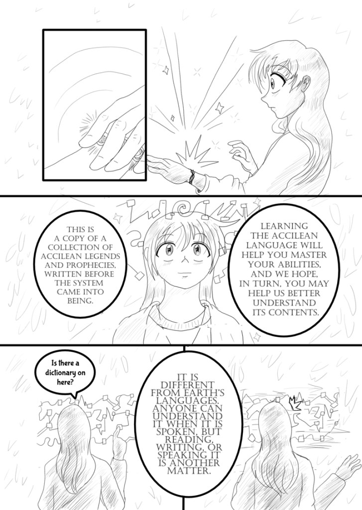 “This is a copy of a collection of Accilean legends and prophecies, written before the system came into being,” the Star explained. “Learning the Accilean language will help you master your abilities, and we hope, in turn, you may help us better understand its contents.”