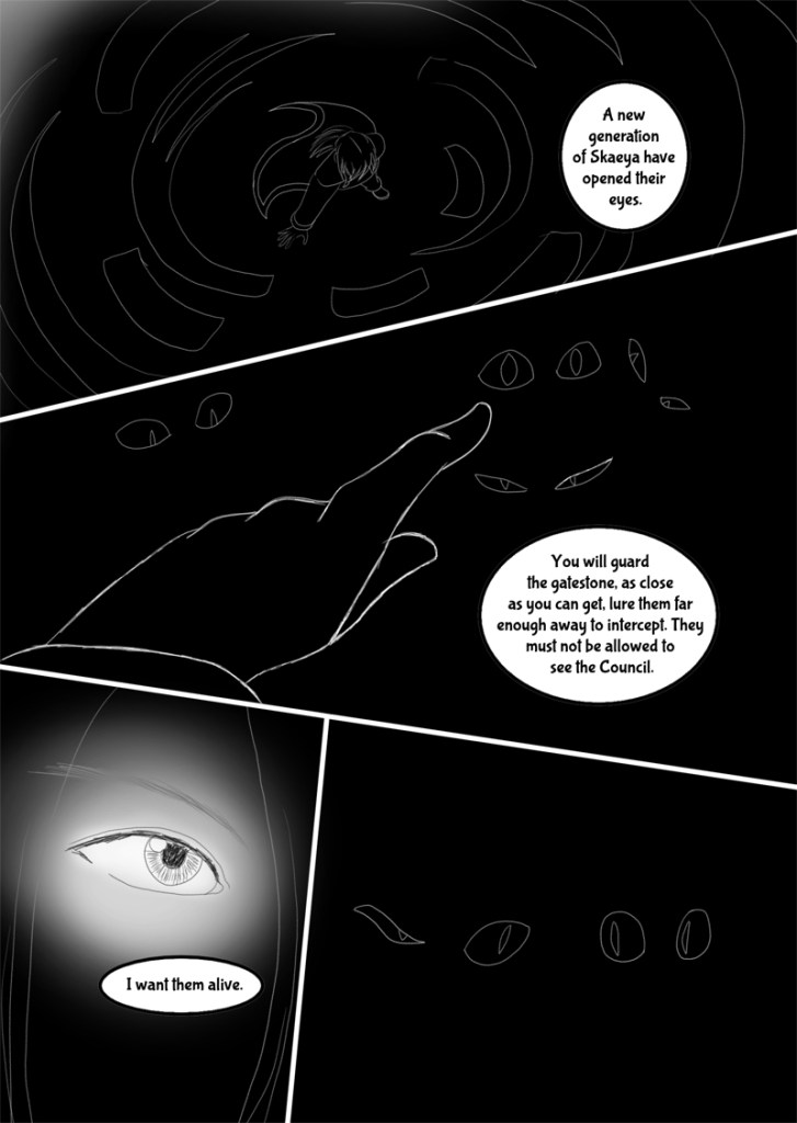The drones flowed around him as he walked to the center of the room. He stared up, reaching out with his mind, hooking into them. He chose ten, nine tailless “stubs” and one a bit more advanced, and moved them close, as easily as moving his own arm. His voice rapped the walls. “A new generation of Skaeya have opened their eyes. You will guard the gatestone, as close as you can get, lure them far enough away to intercept. They must not be allowed to see the Council.” His next order had the more sentient among them exchanging glances. “I want them alive.”