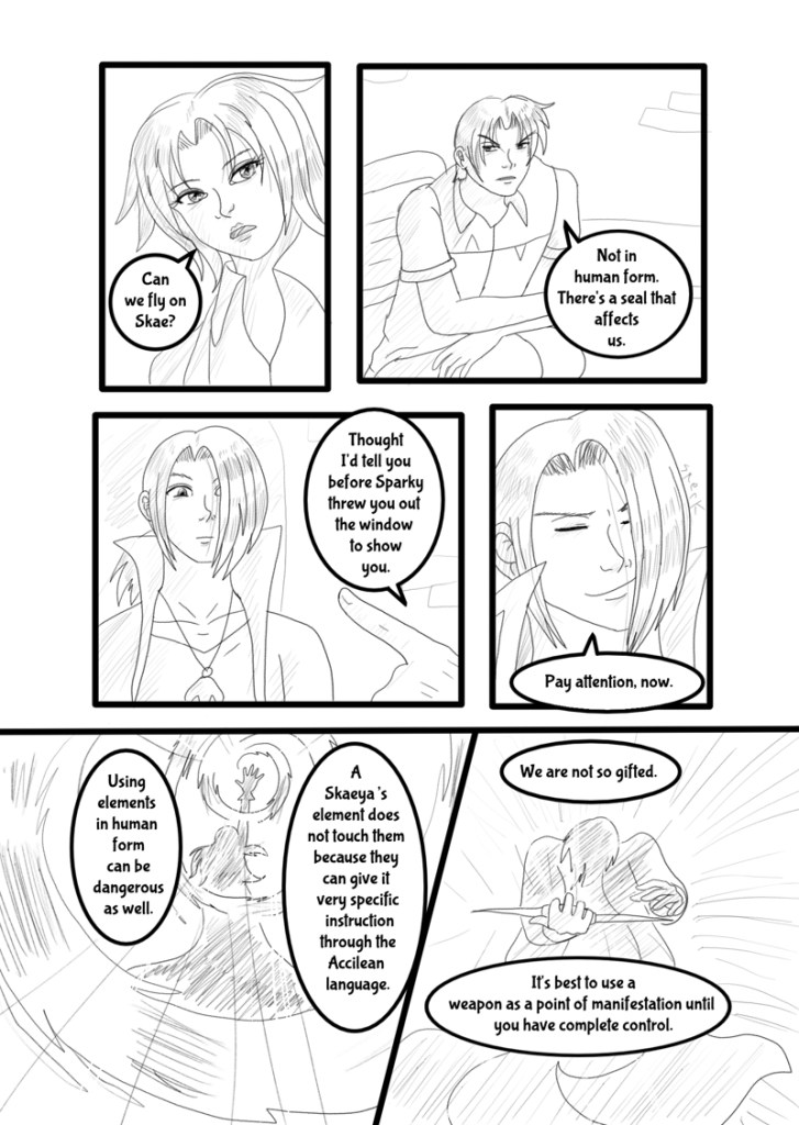 Kestrel suppressed his laughter, though a grin escaped. “Pay attention now. Using elements in human form can be dangerous as well. A Skaeya’s element does not touch them because they can give it very specific instruction through the Accilean language. We are not as gifted. It’s best to use a weapon as a point of manifestation until you have complete control.”